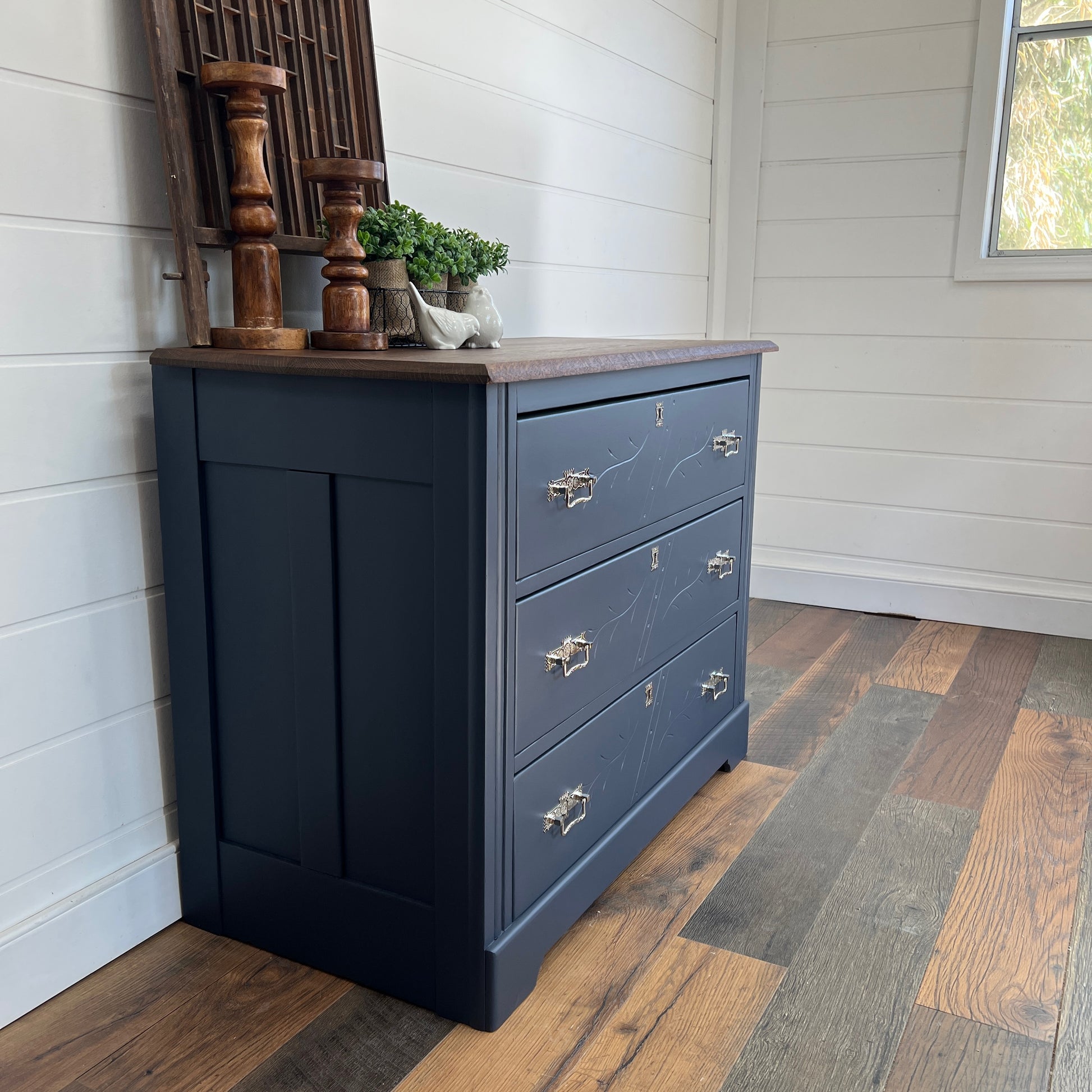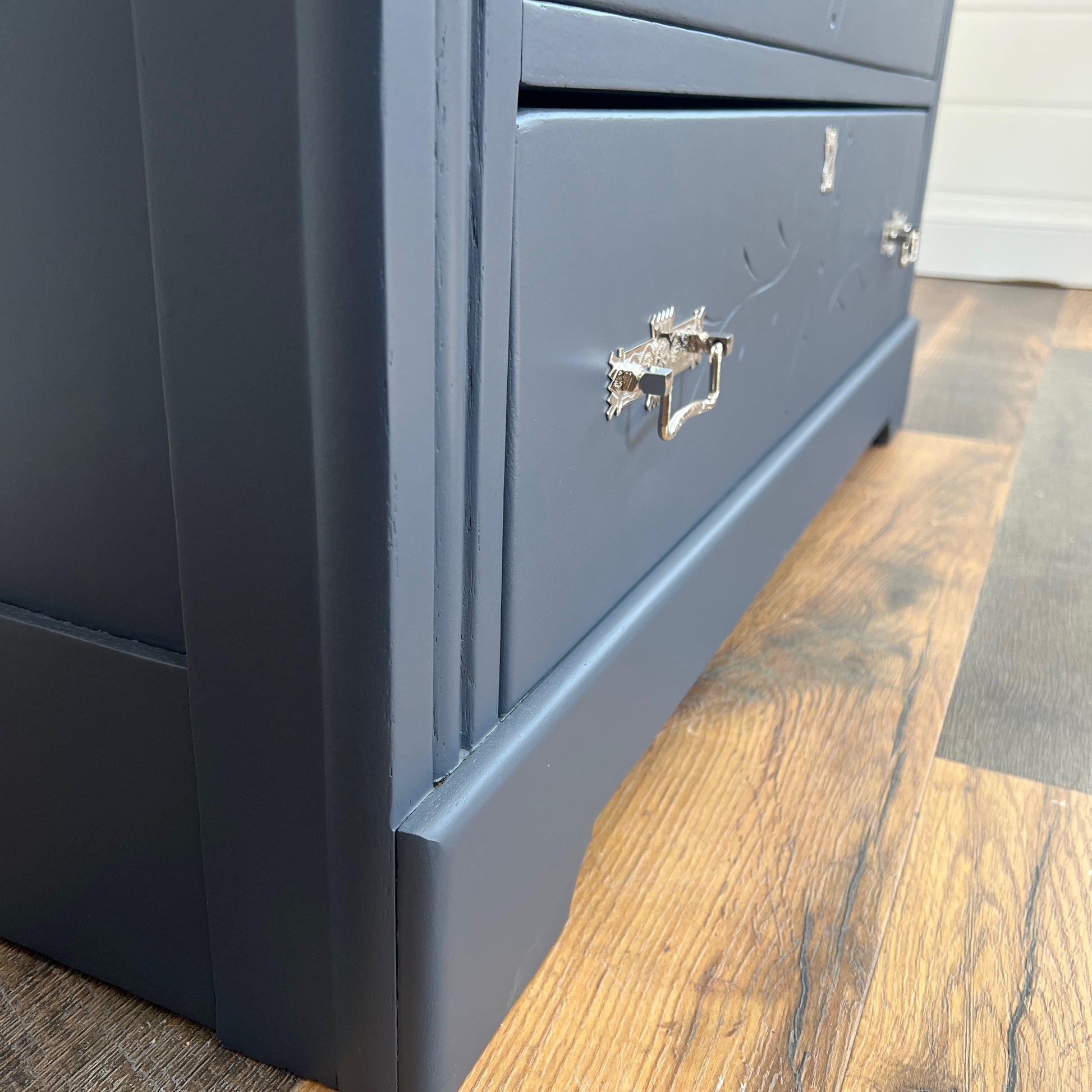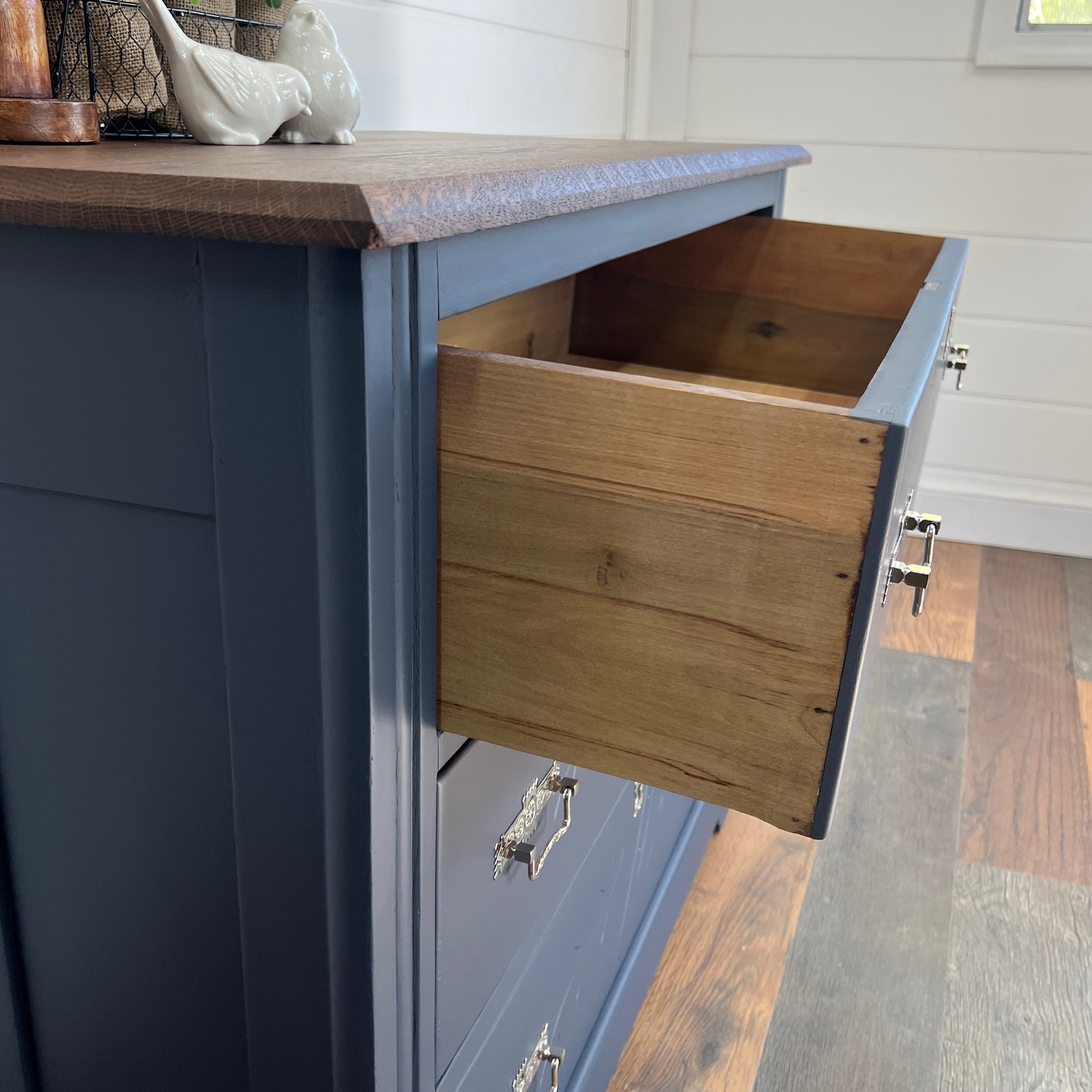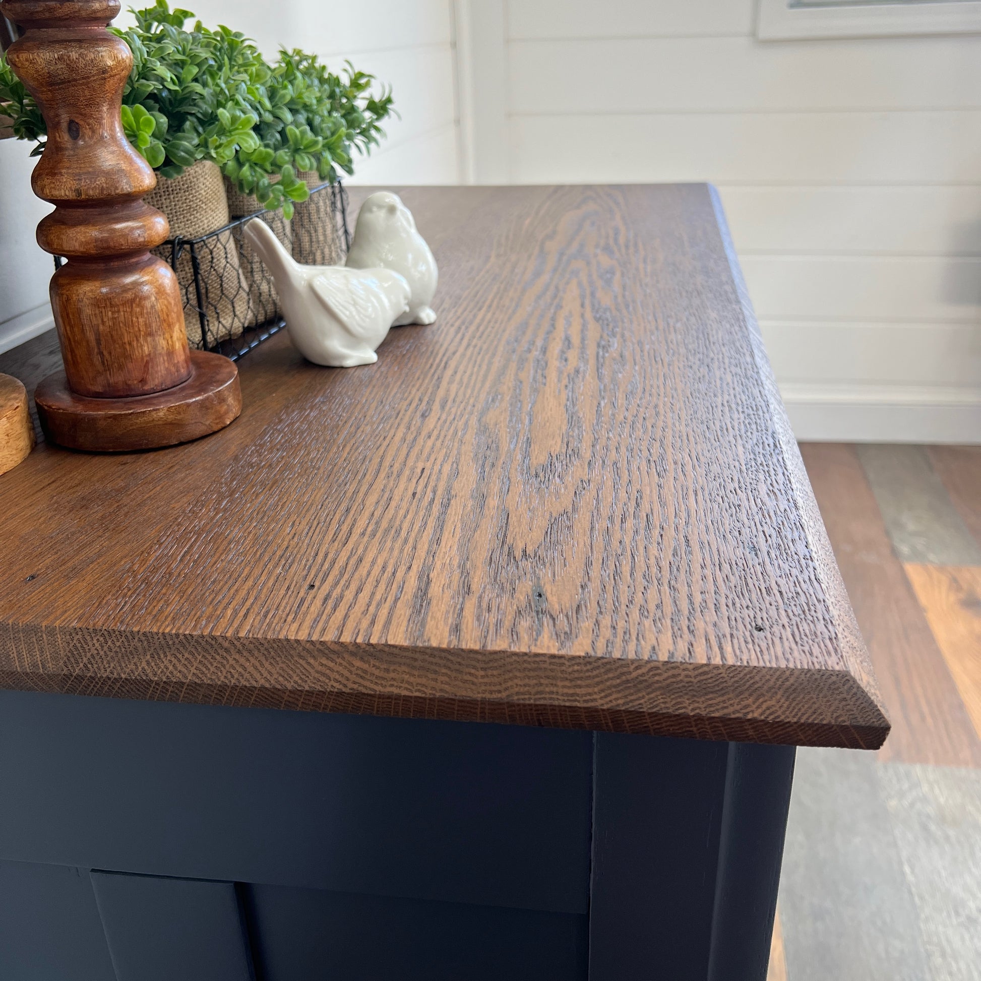 Features a dark navy blue color with a dark walnut stained top. It also has period correct silver hardware.
