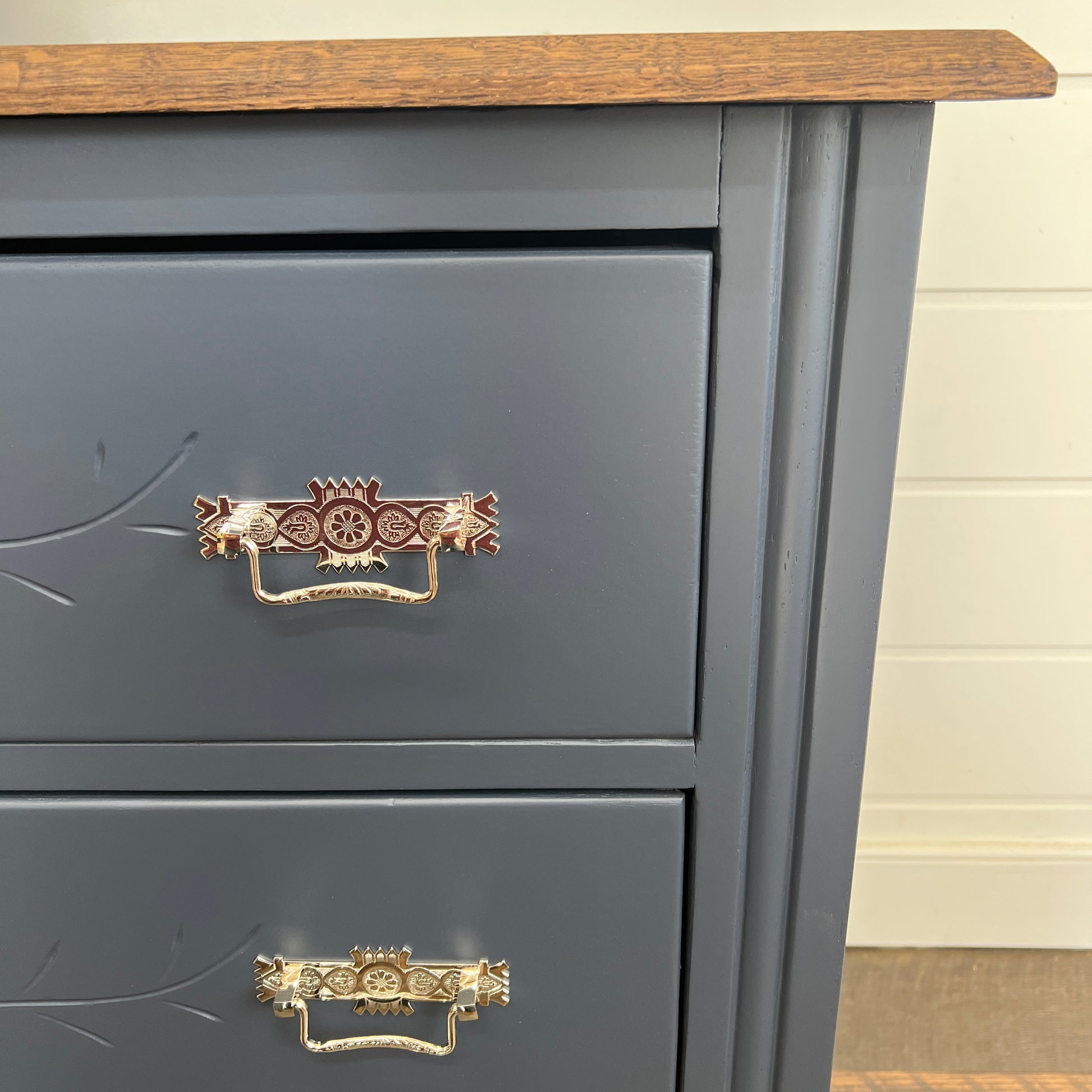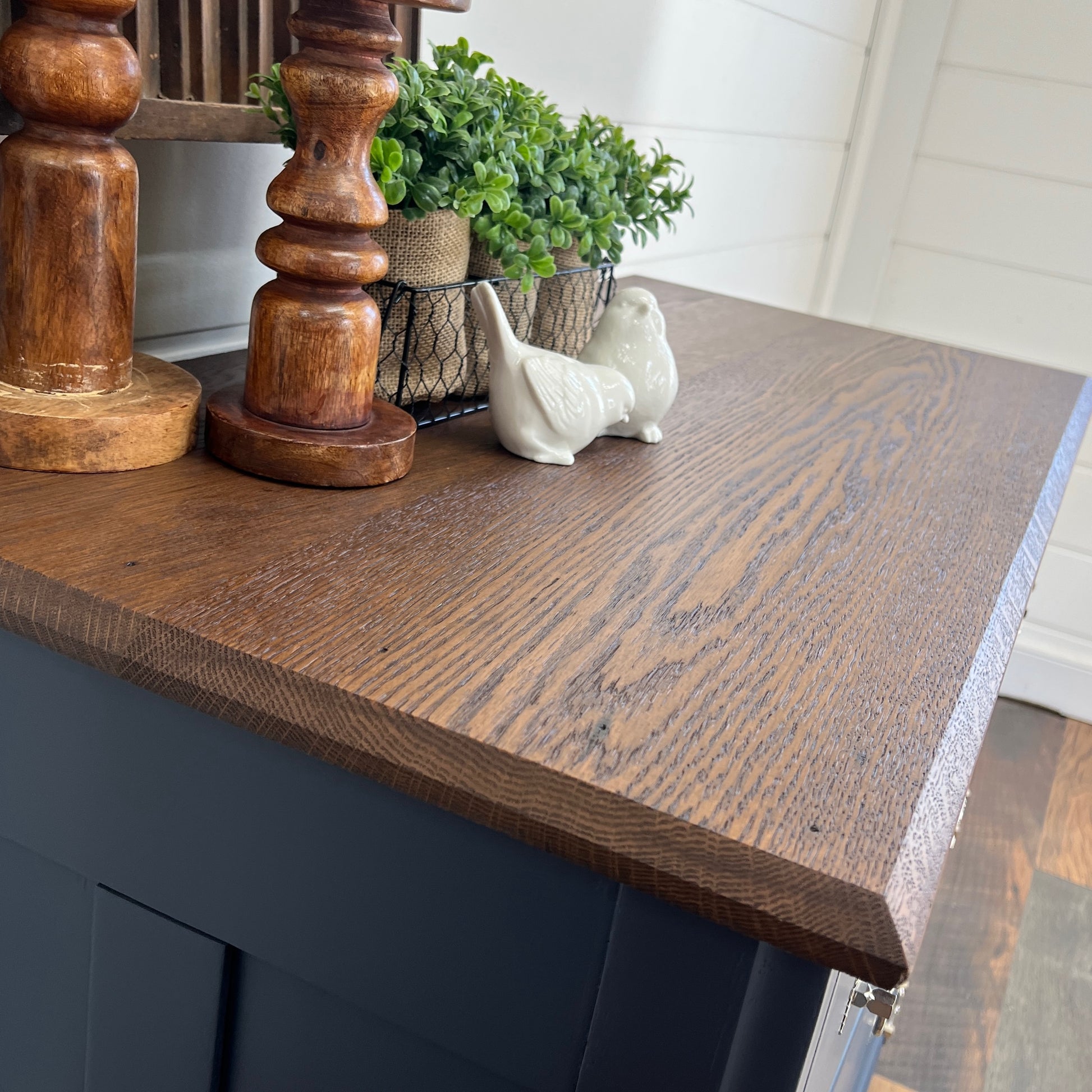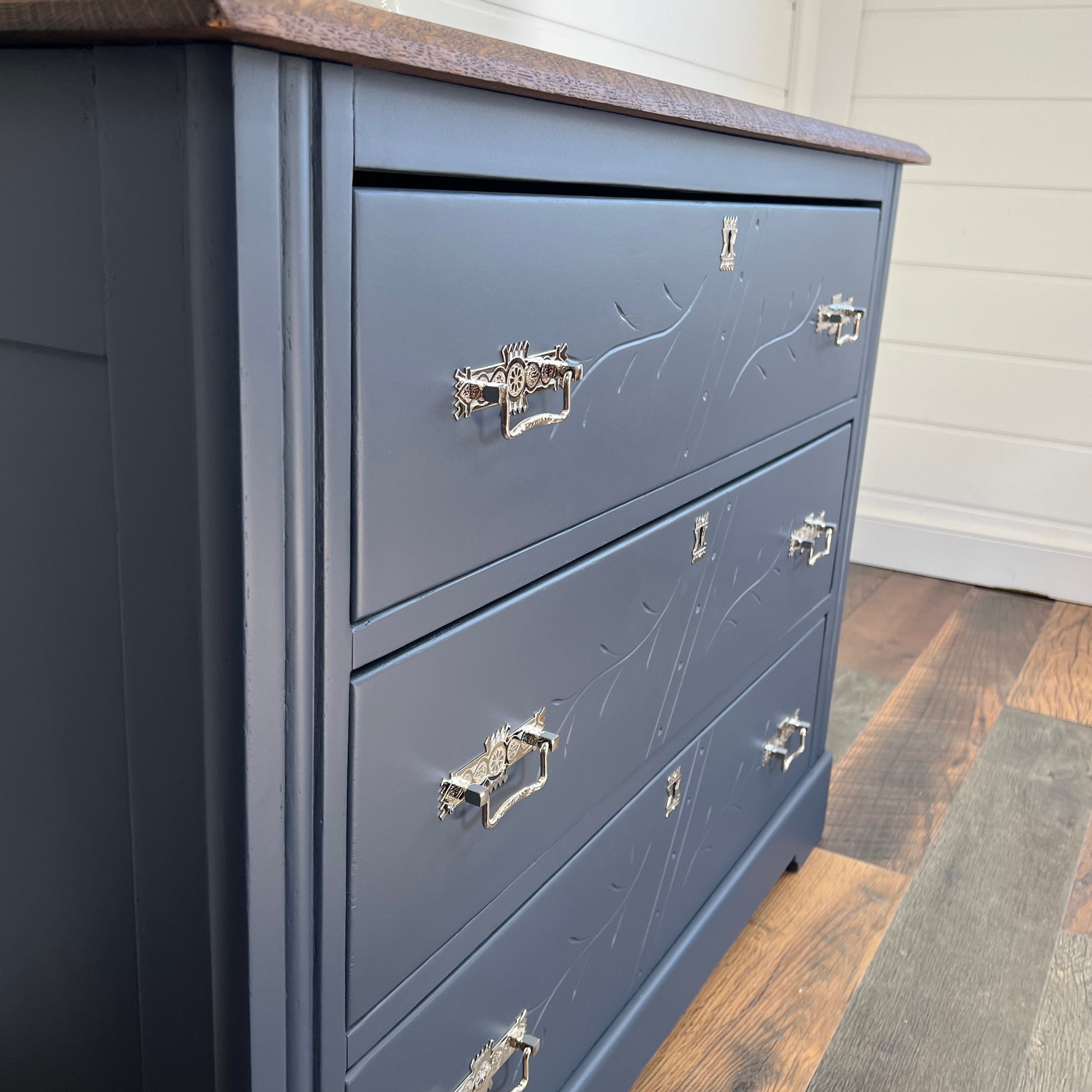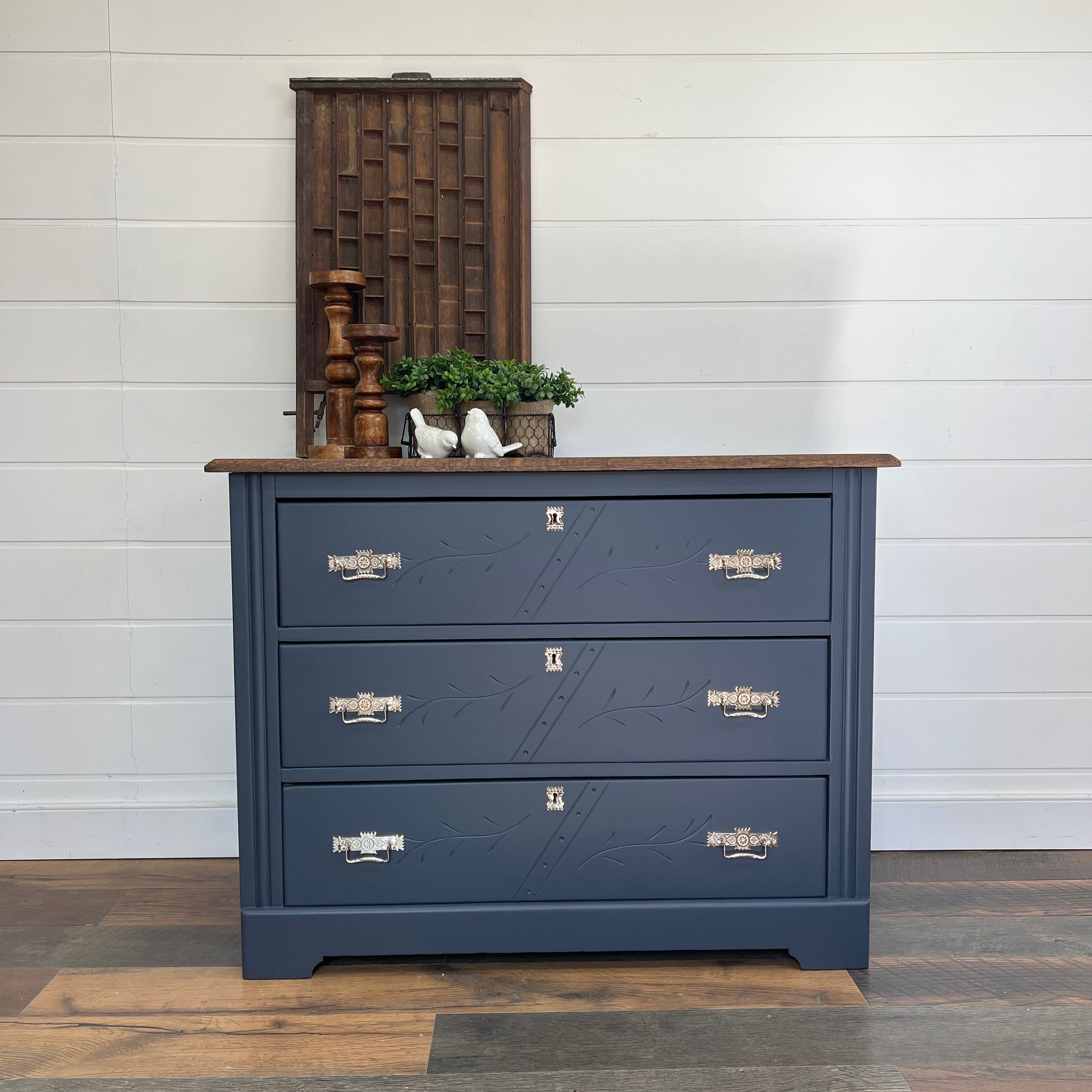 Features a dark navy blue color with a dark walnut stained top. It also has period correct silver hardware.