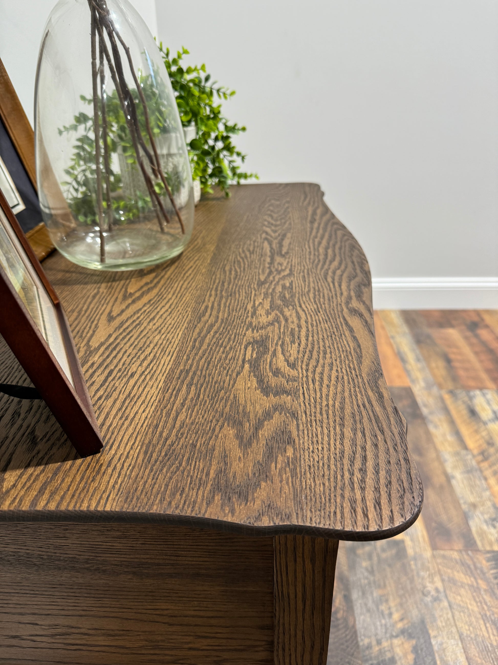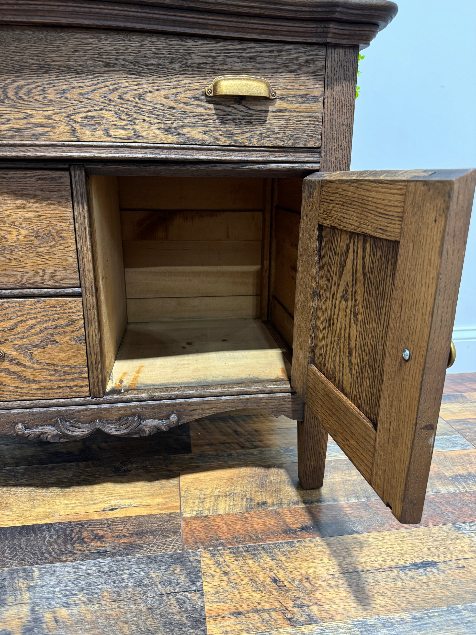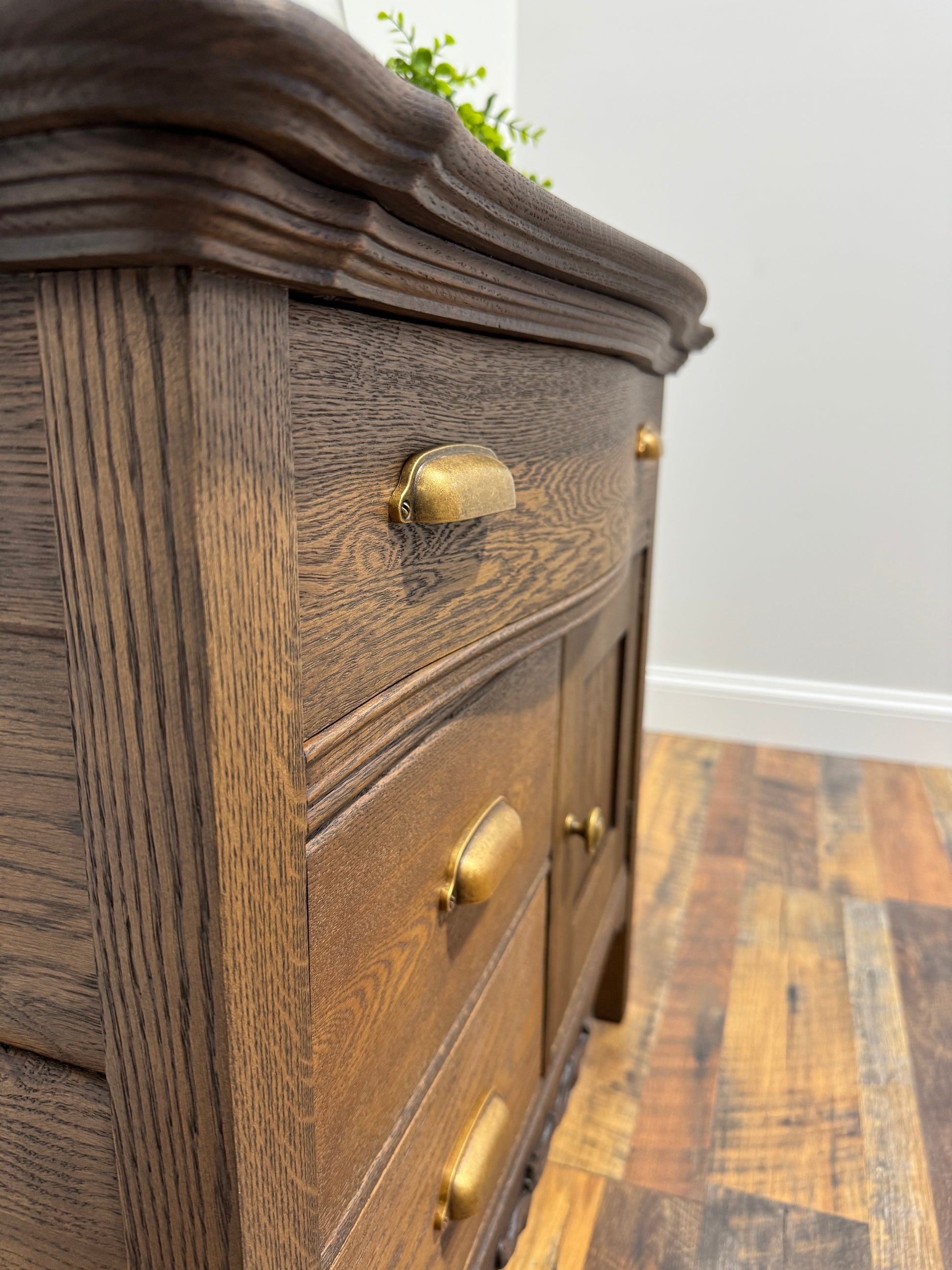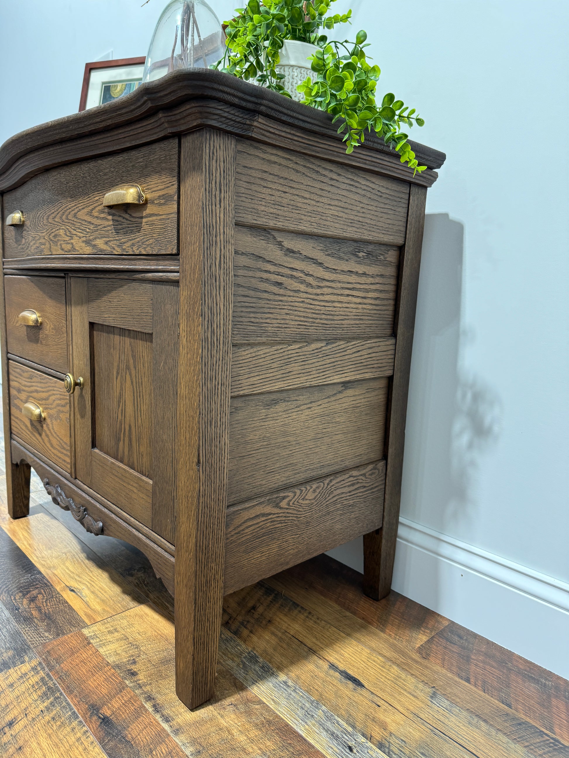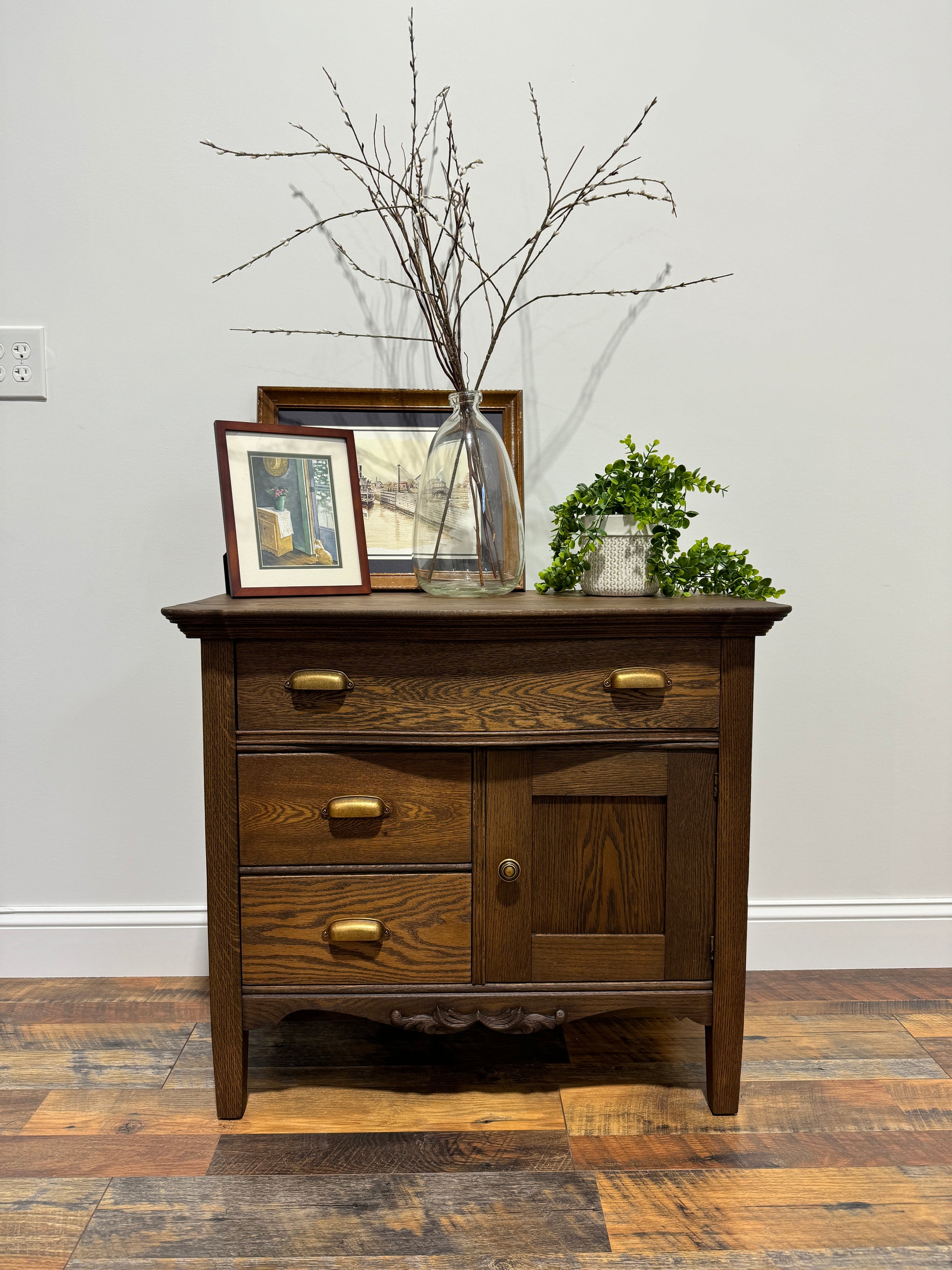 Washstand features 3 drawers and one door for added storage. The top of the washstand and the top drawer feature a curvy, serpentine shape.