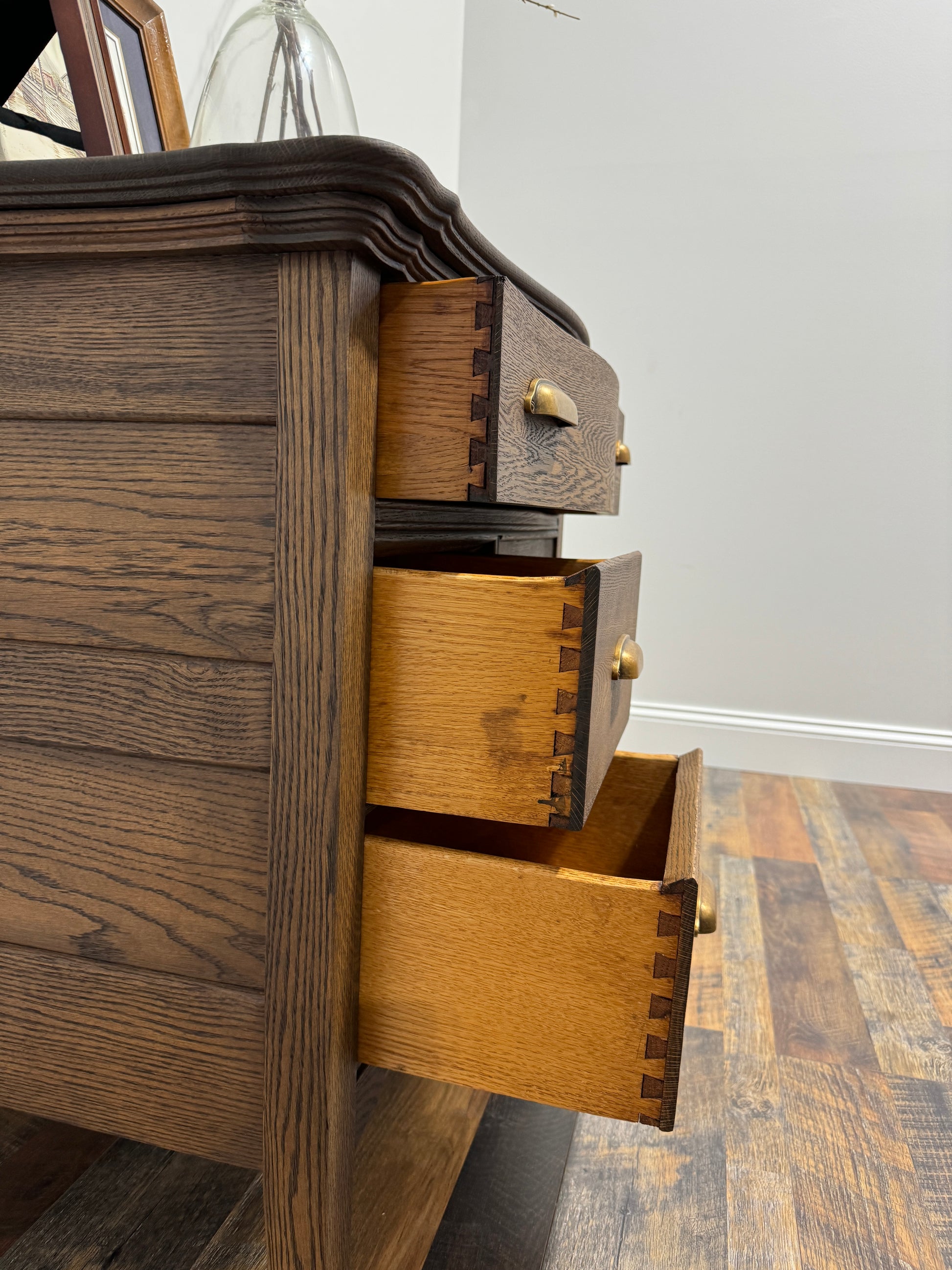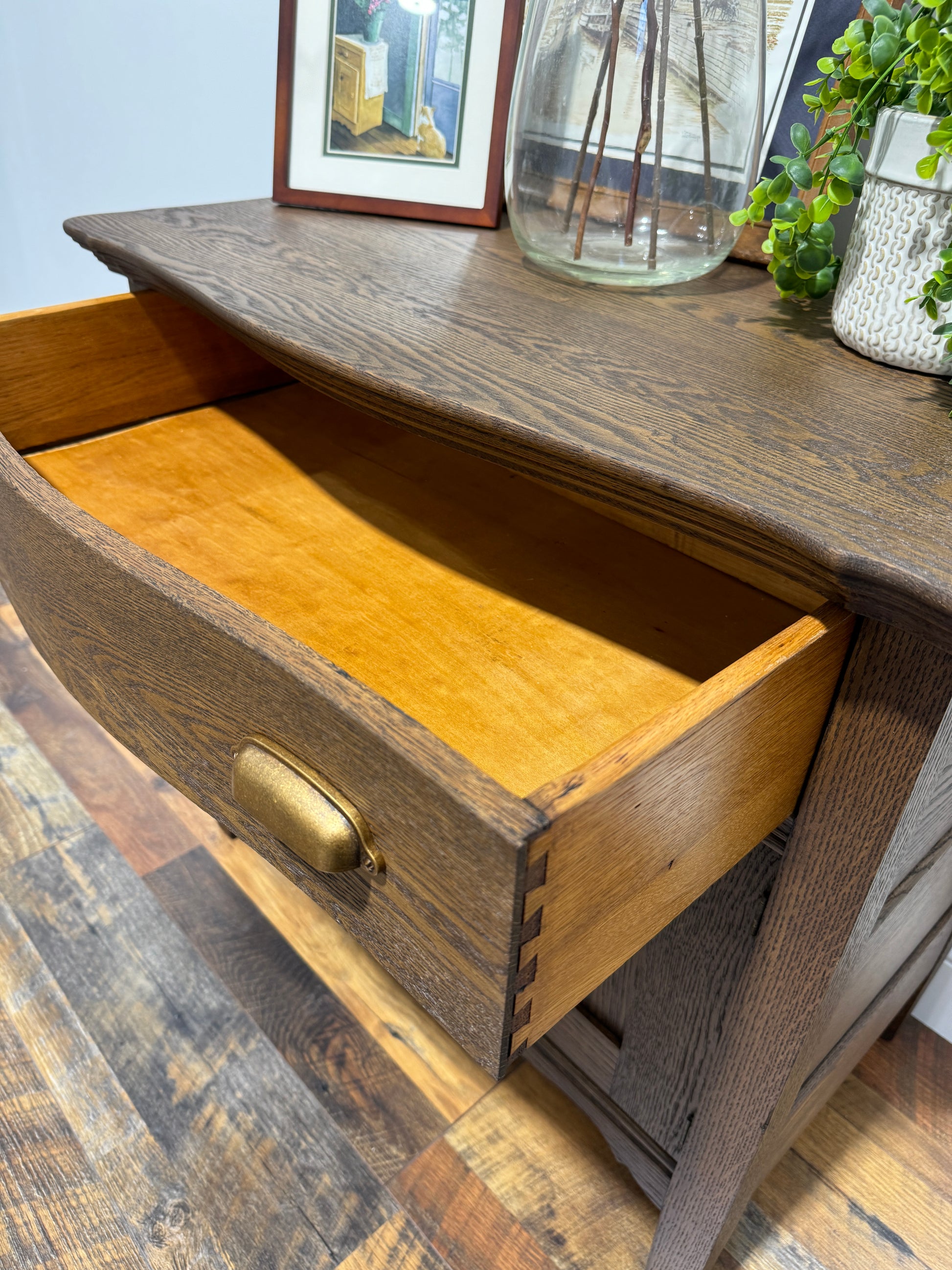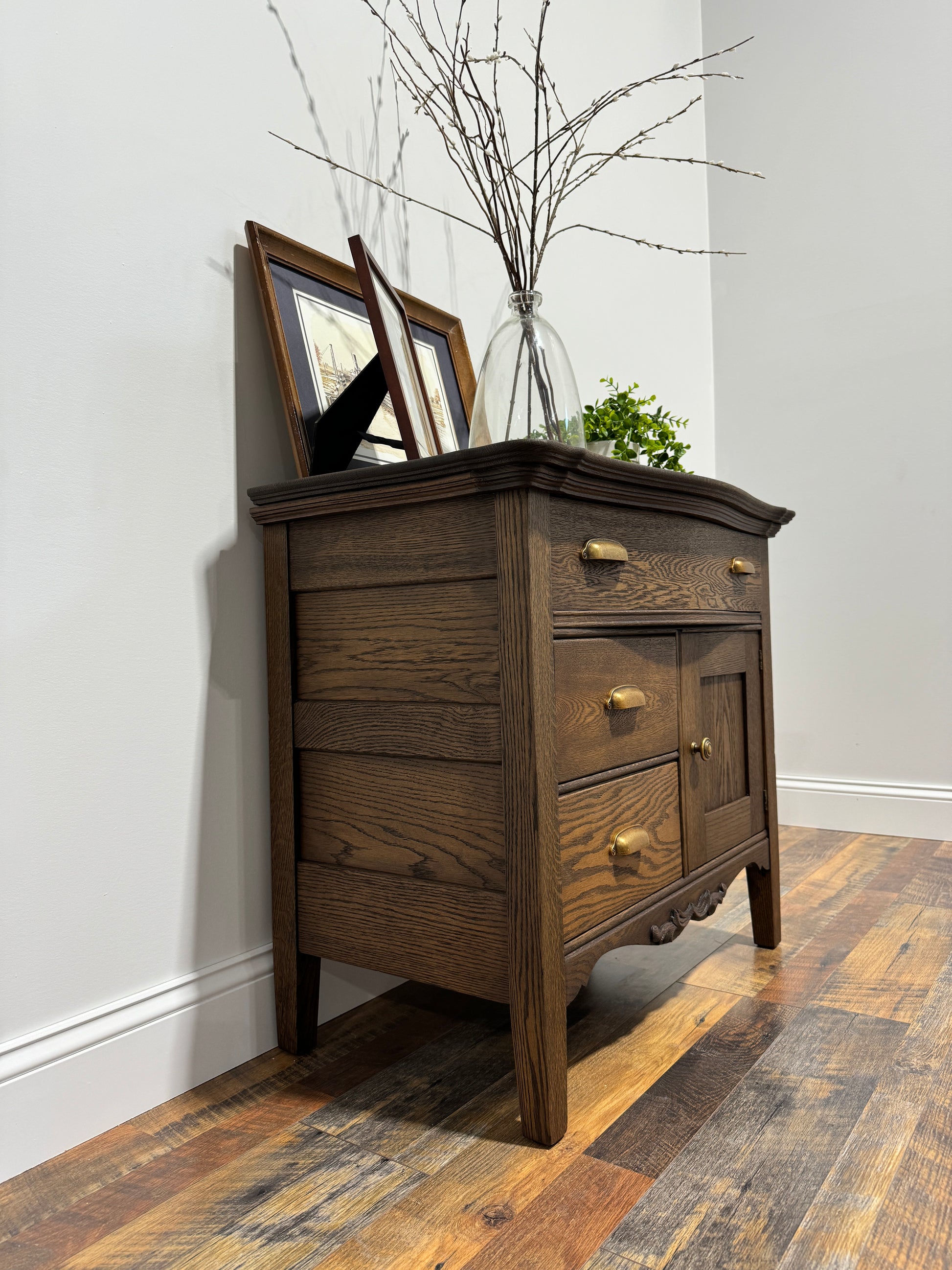 The washstand has a deep, rich, and dark stain color that is complemented well with antique brass cup pulls.