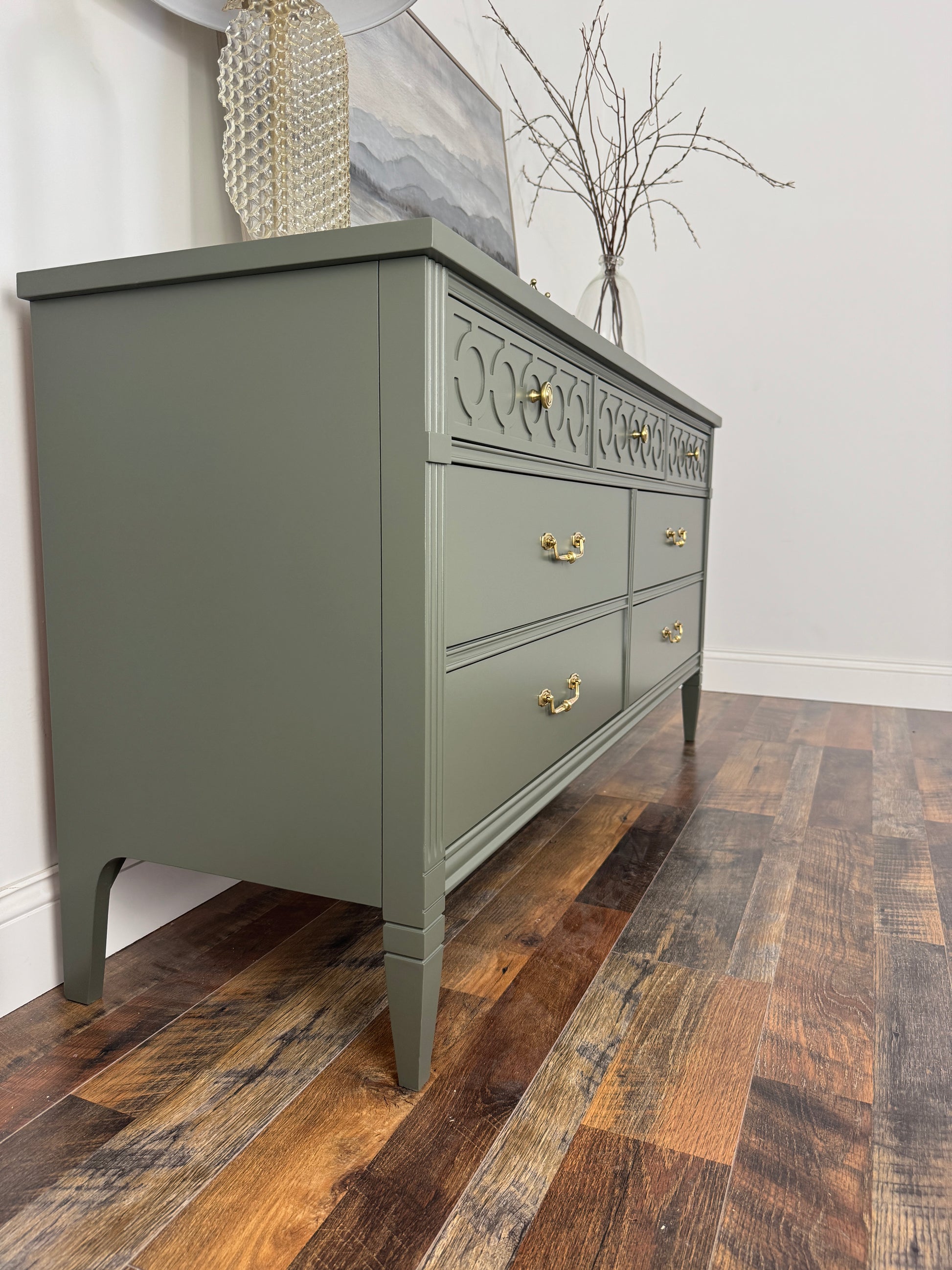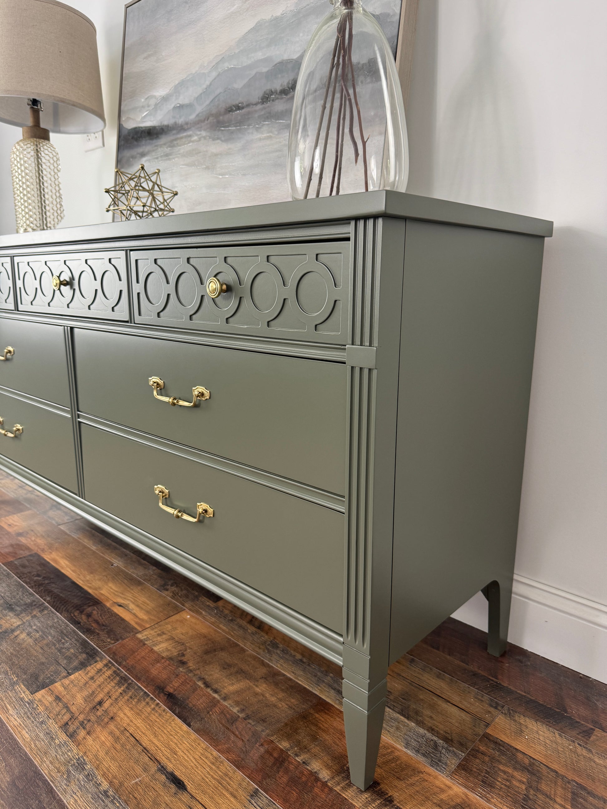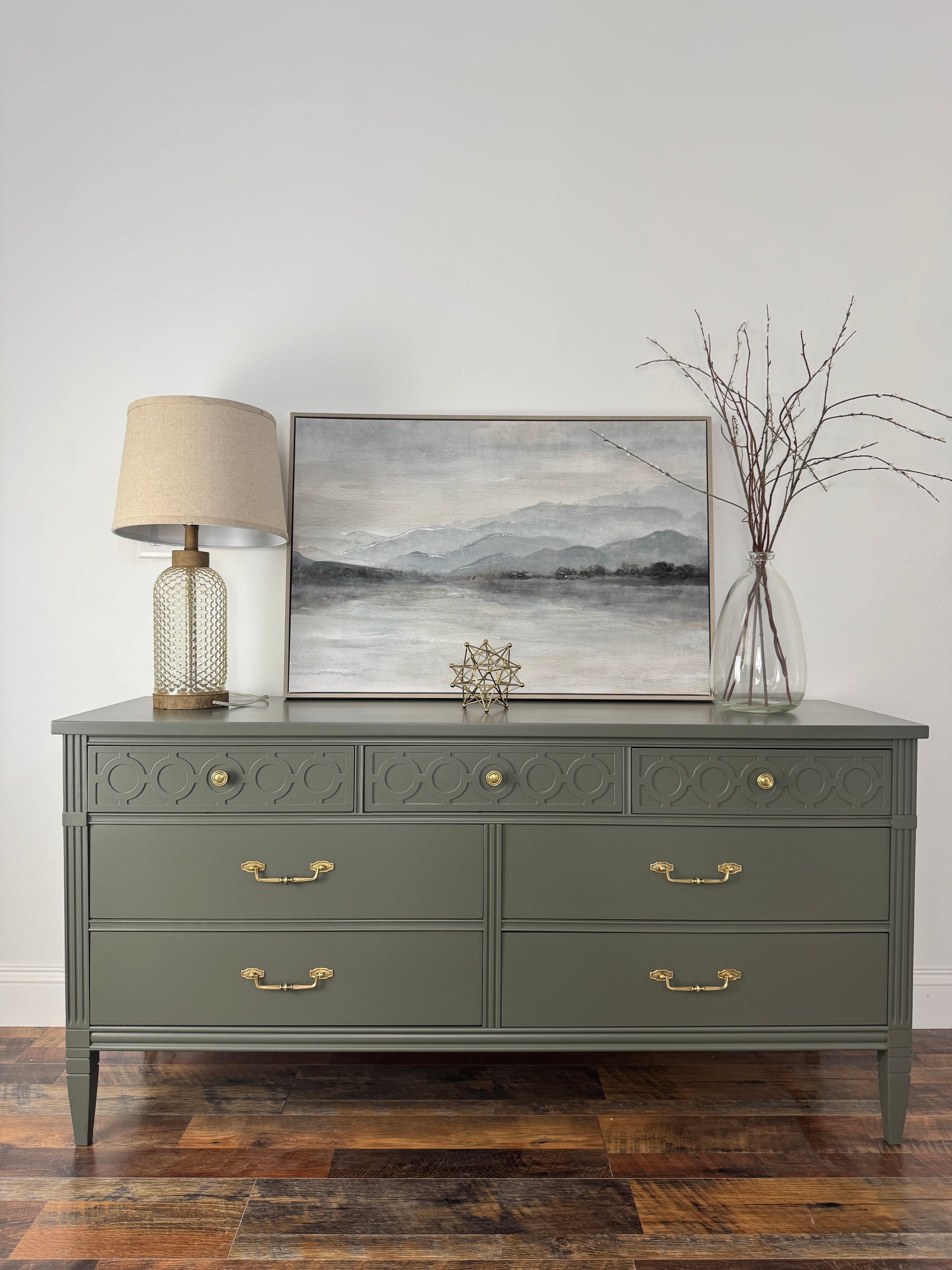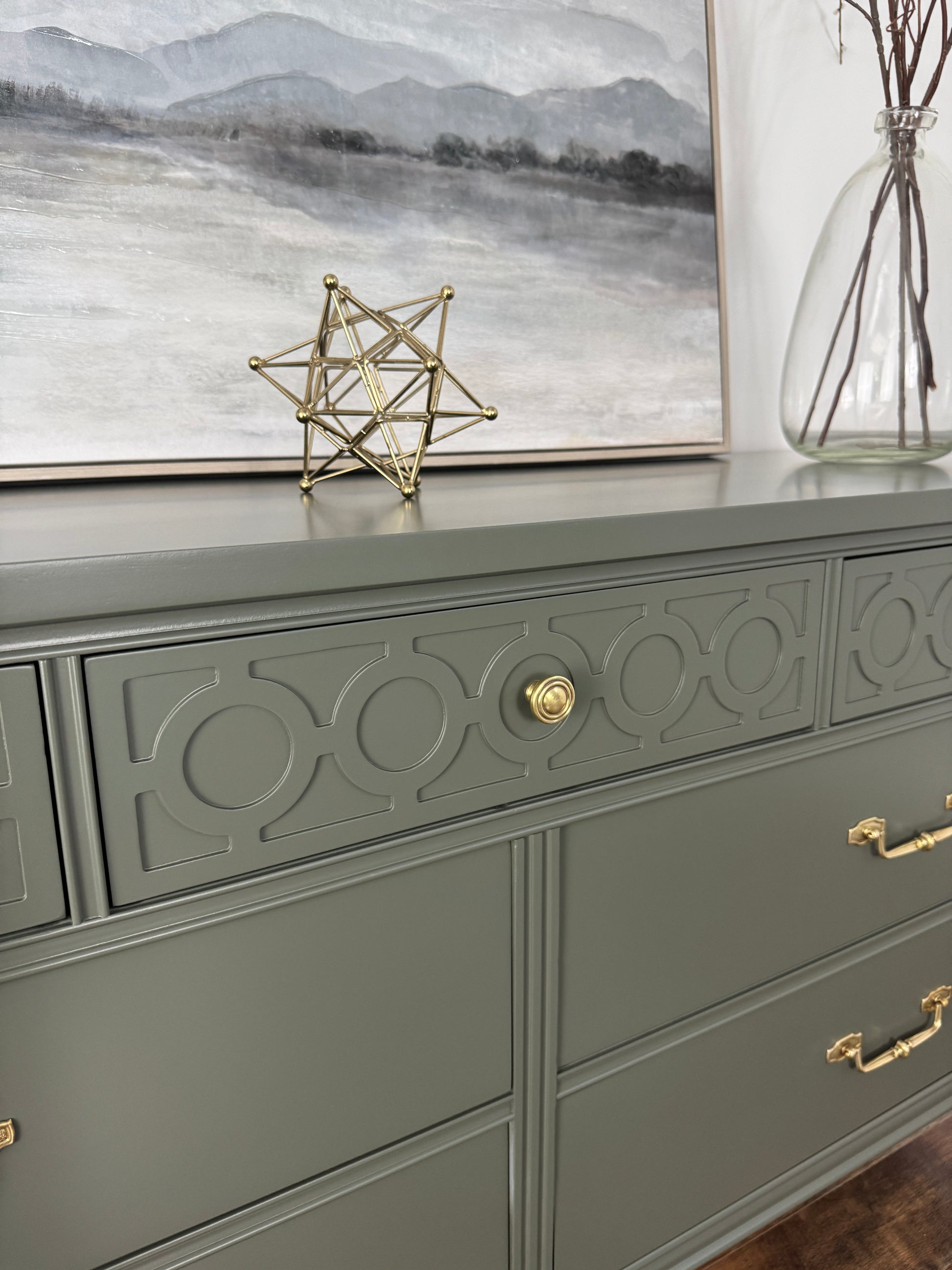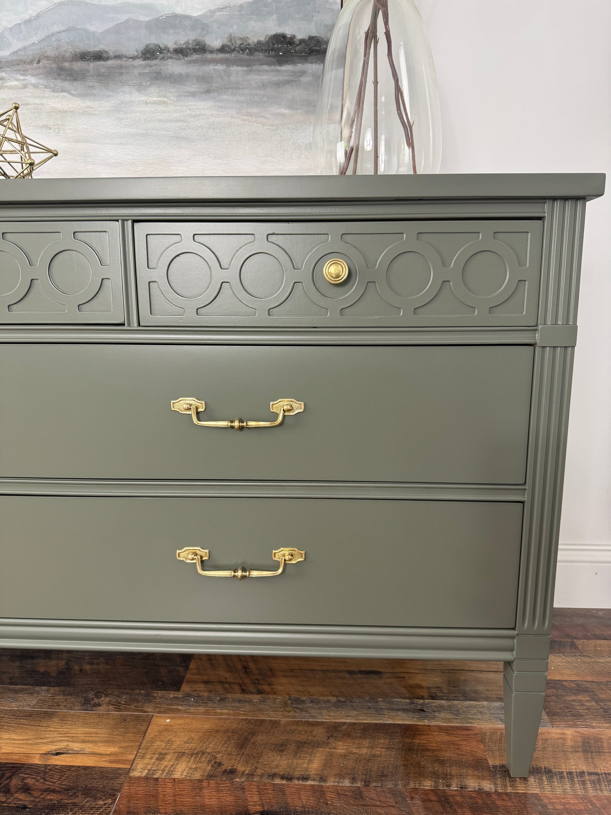 Stunning Bassett furniture dresser in sophisticated sage green finish. This high-quality piece features beautiful decorative circle overlays on the top three drawers and elegant original brass hardware throughout. Brand: Bassett Furniture (known for quality craftsmanship)