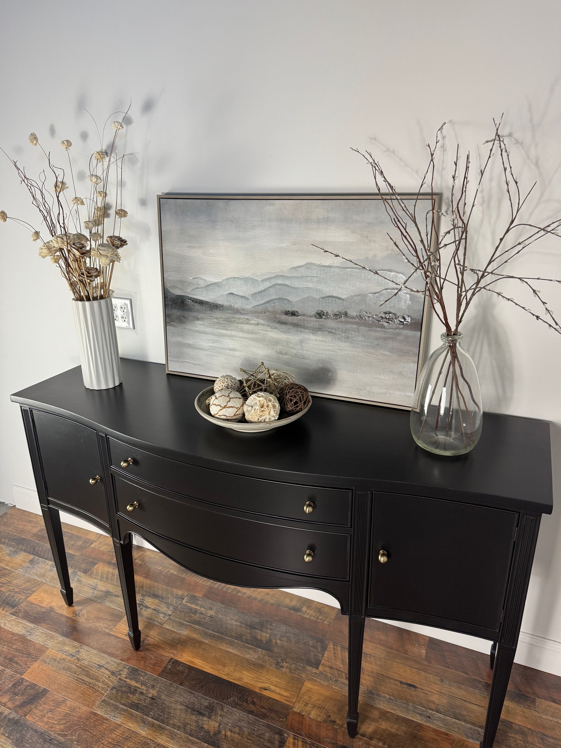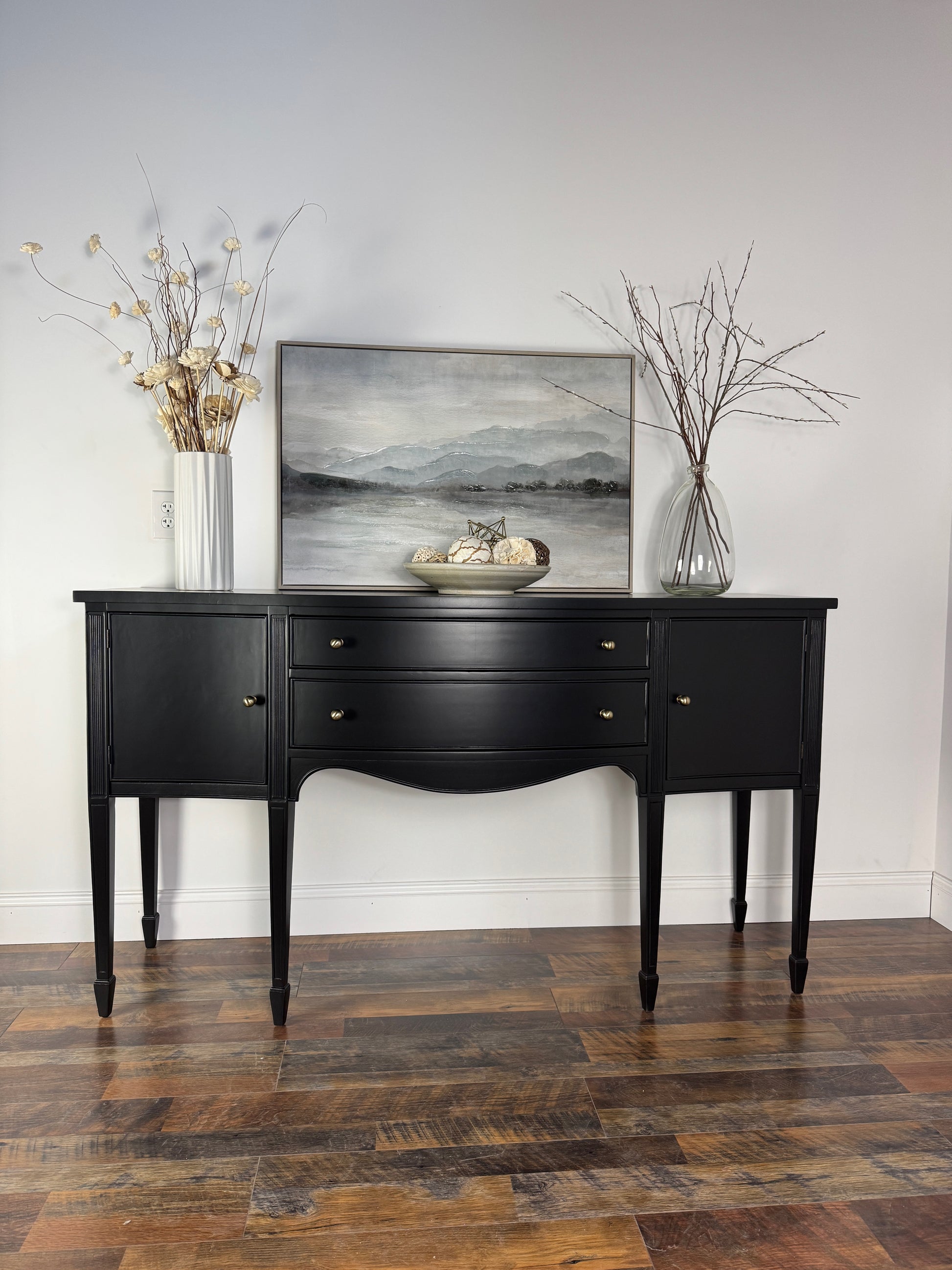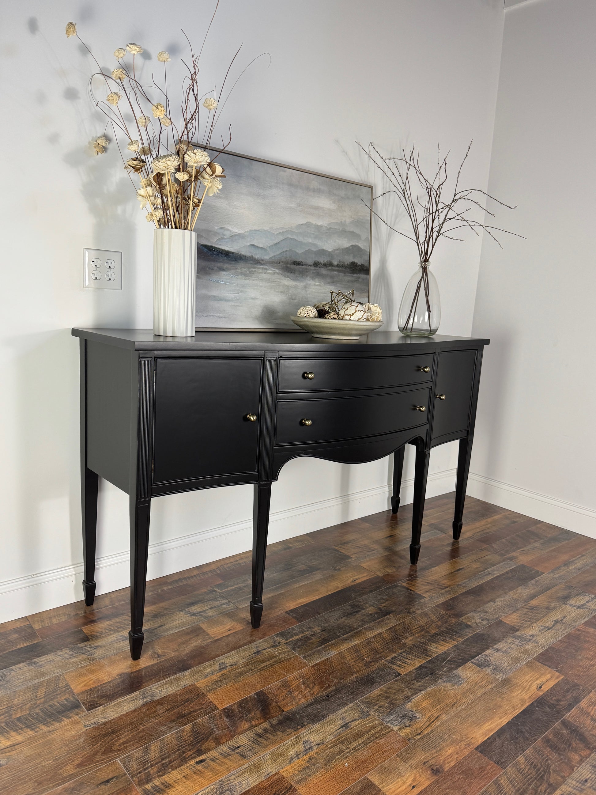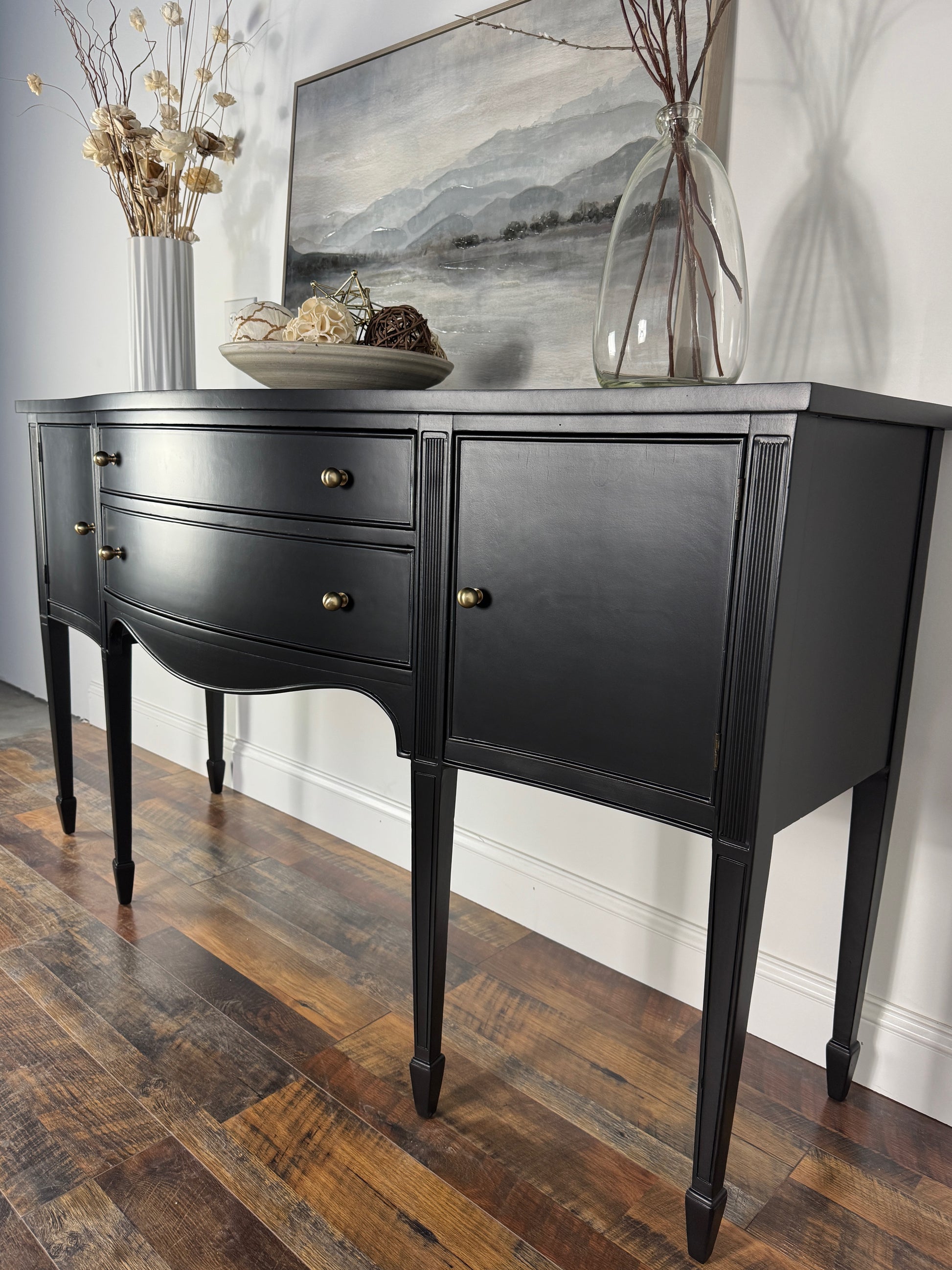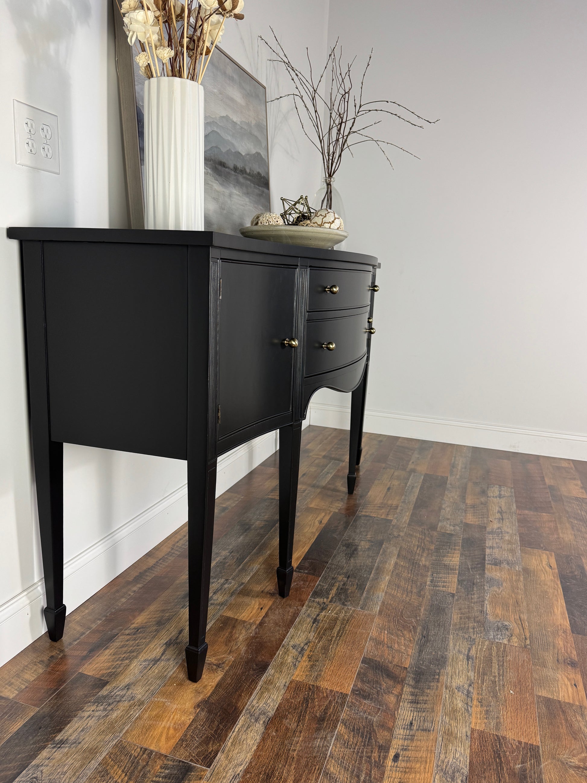 This is a vintage solid wood piece in perfect working order. It was a curve bow-front buffet with solid brass hardware.