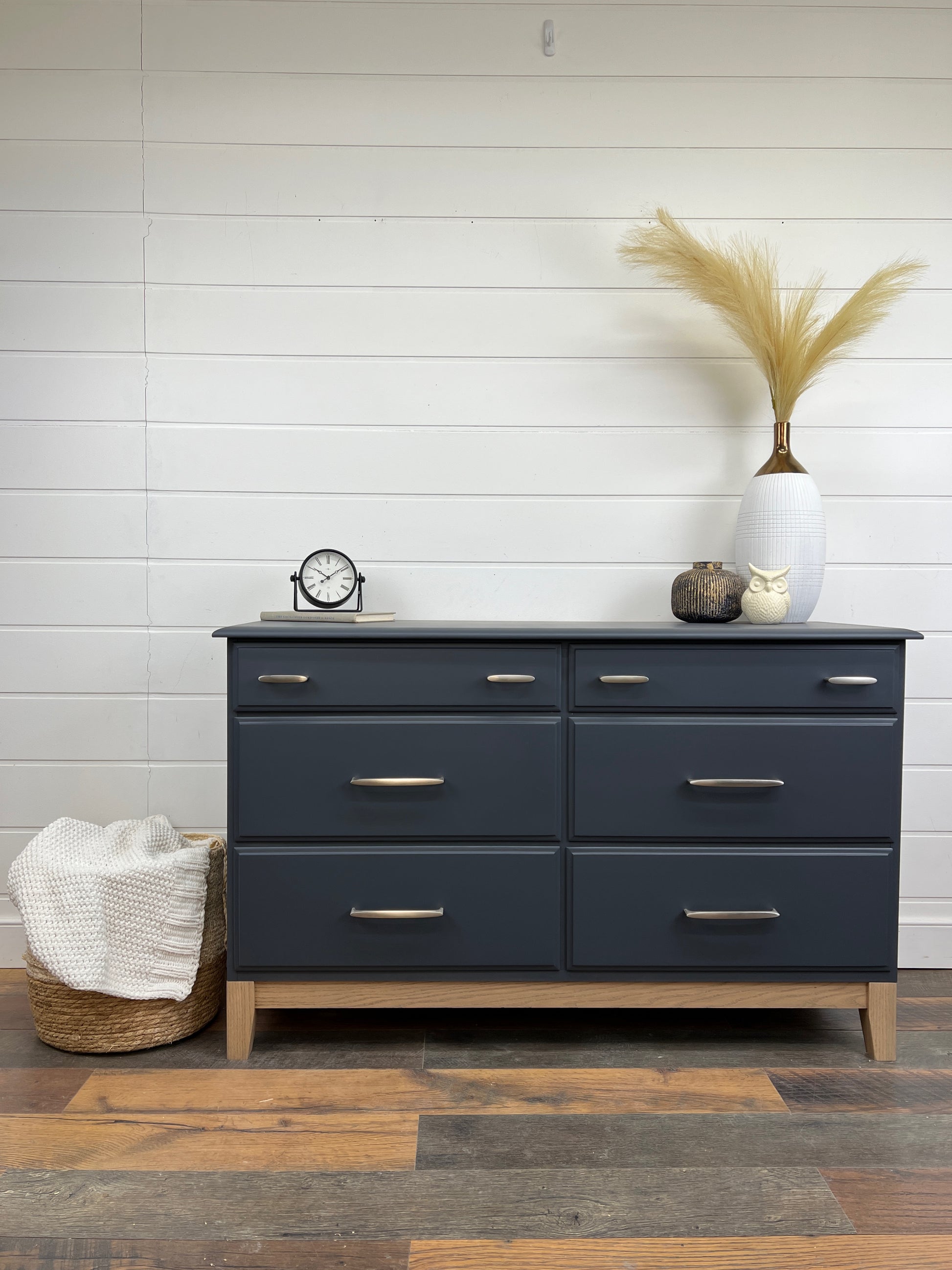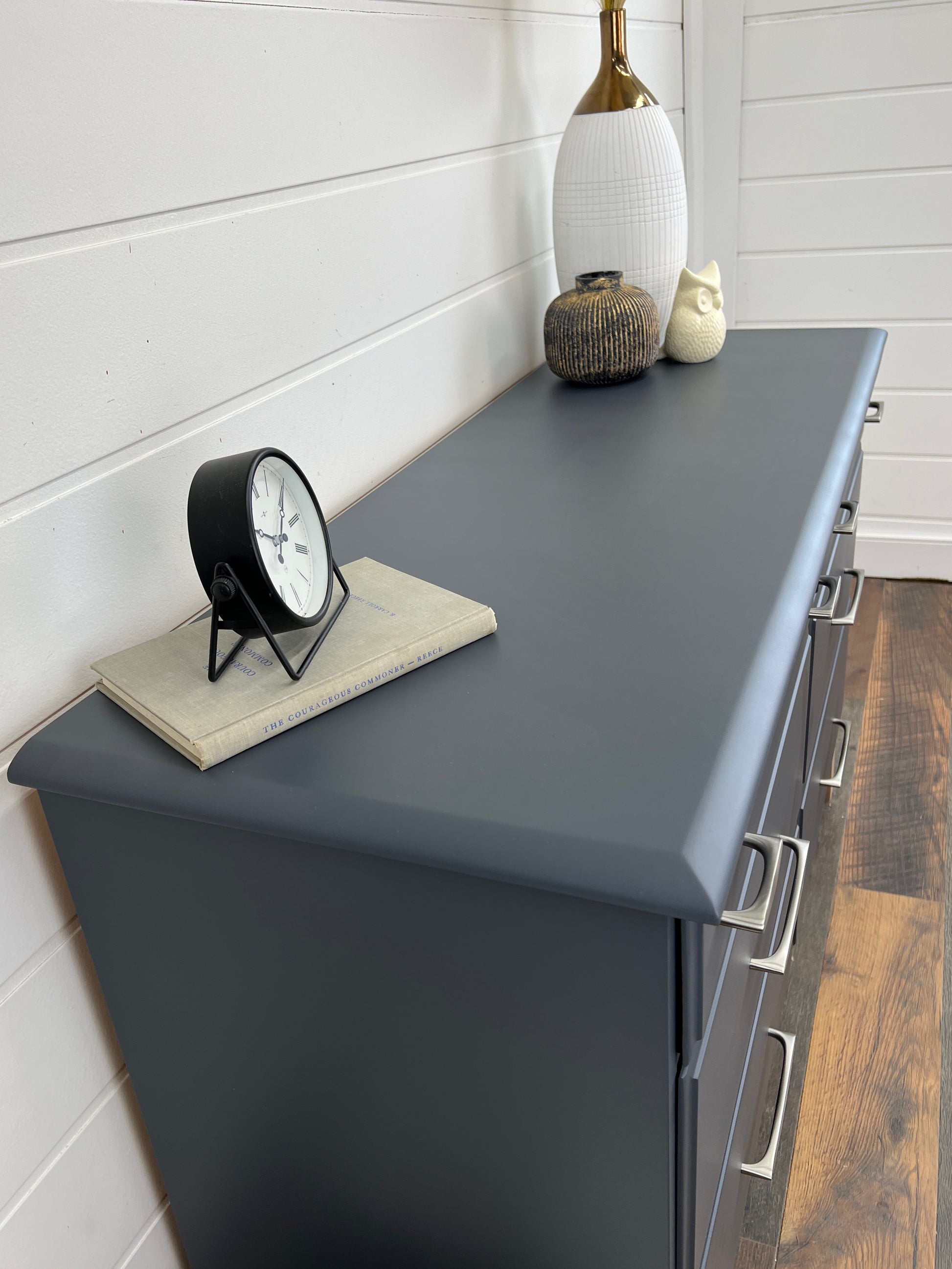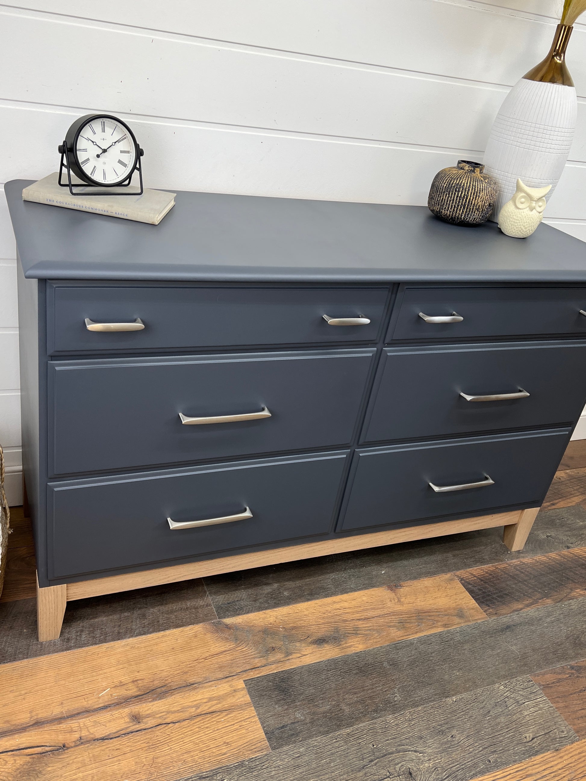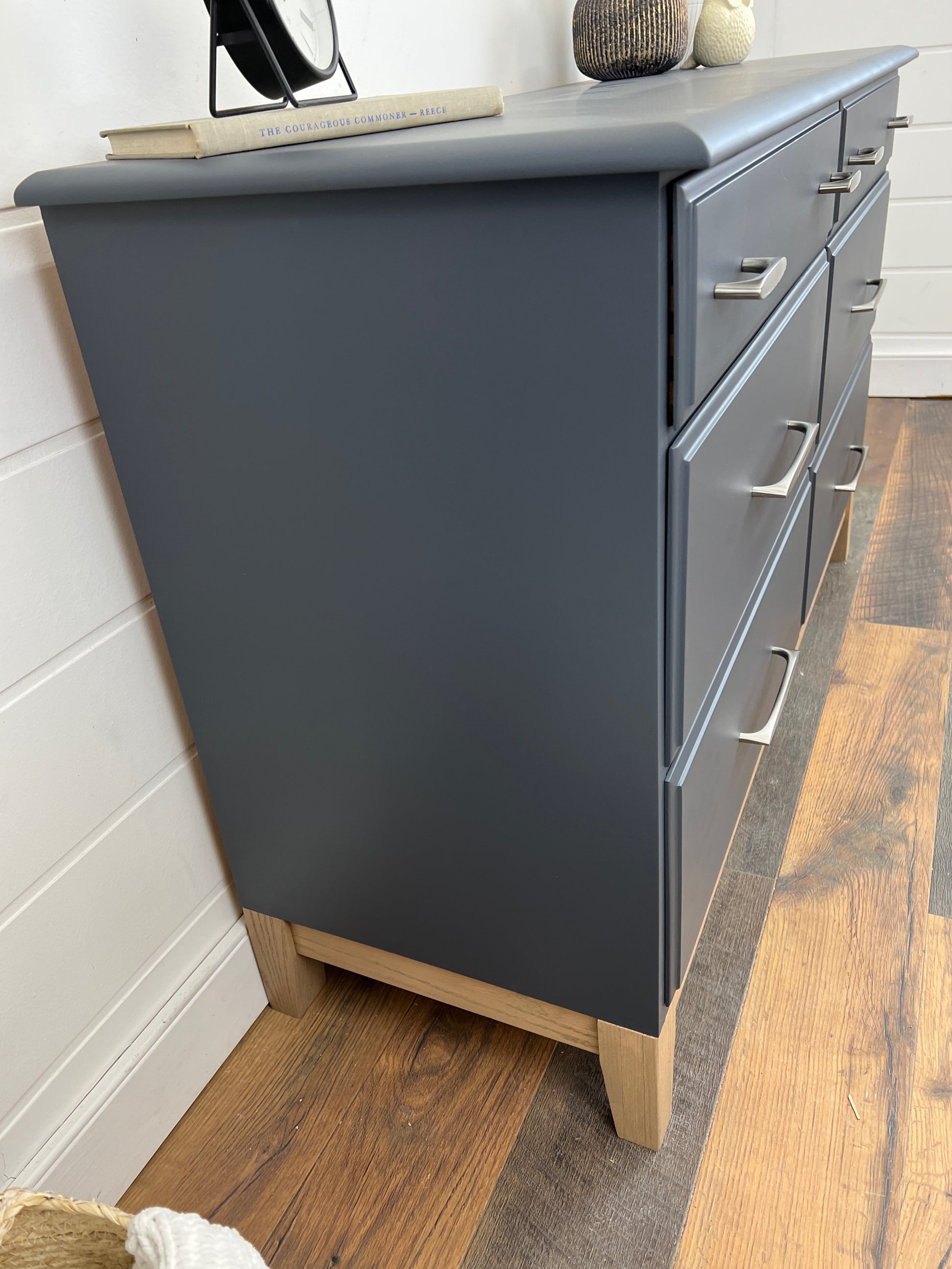 The dresser itself was made of solid cherry. It features a lovely dark gray/blue color, and sleek modern drawer pulls that are chrome in color.
