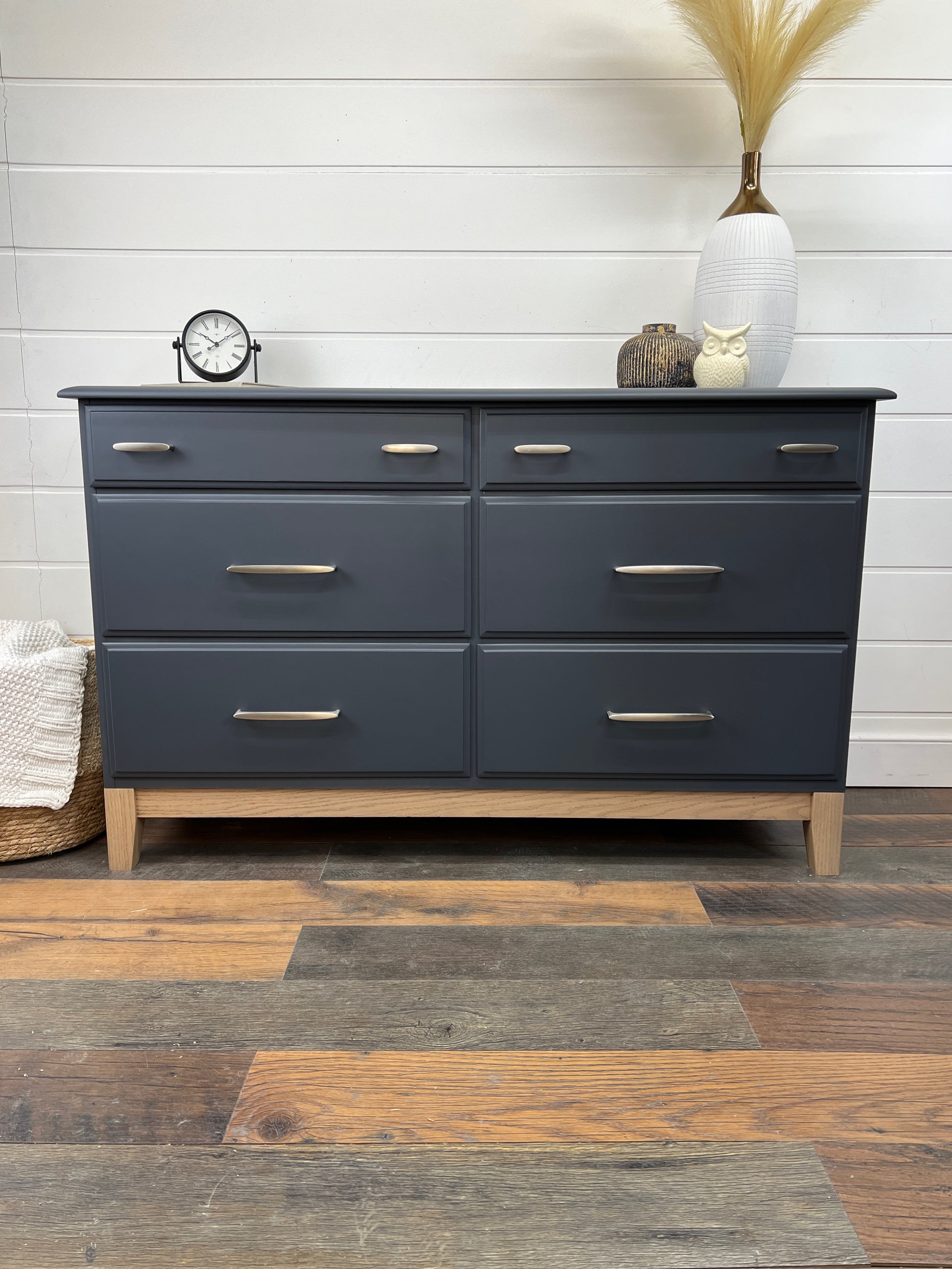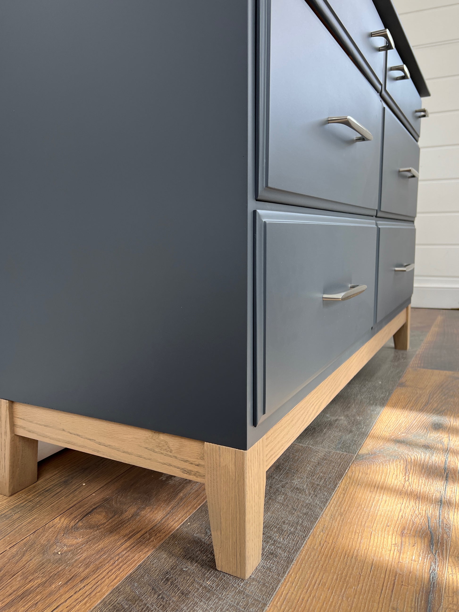 This is a vintage dresser that was modernized. This item was modified by removing the old base and adding a more modern white oak base, which was custom built for this dresser.