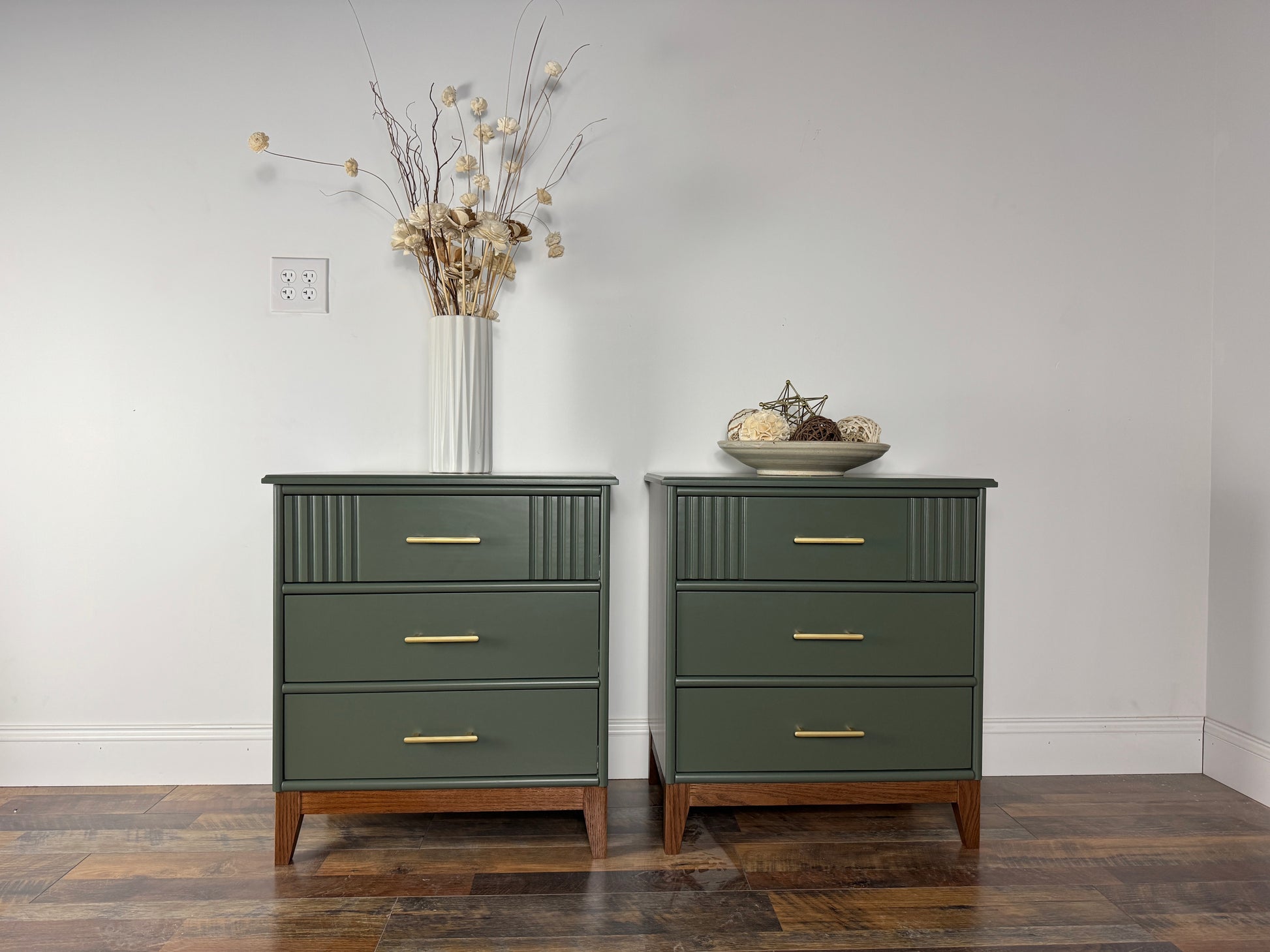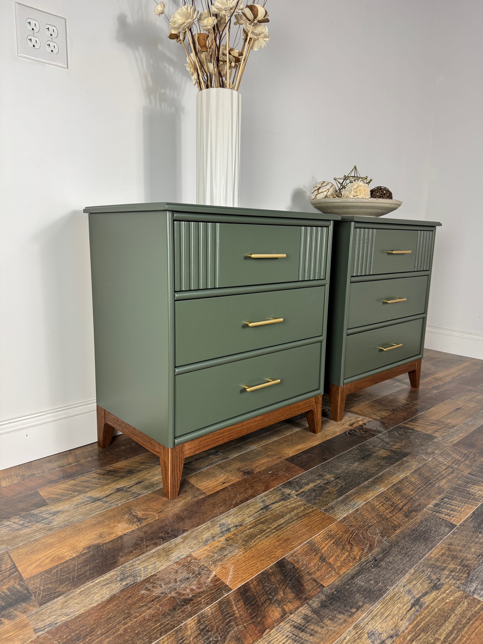 Clean lines are elevated by solid wood angled legs, creating an airy mid-century aesthetic. Three spacious drawers with sleek brass handles provide generous storage while adding warmth and sophistication to any bedroom.