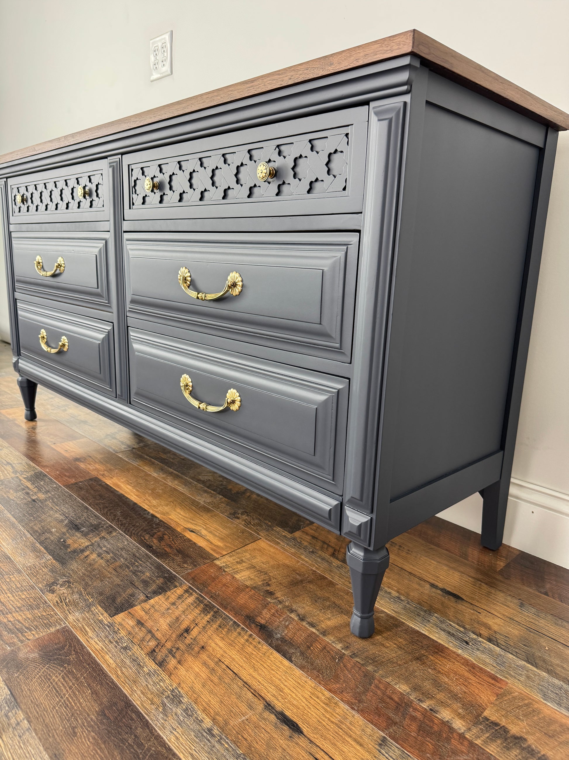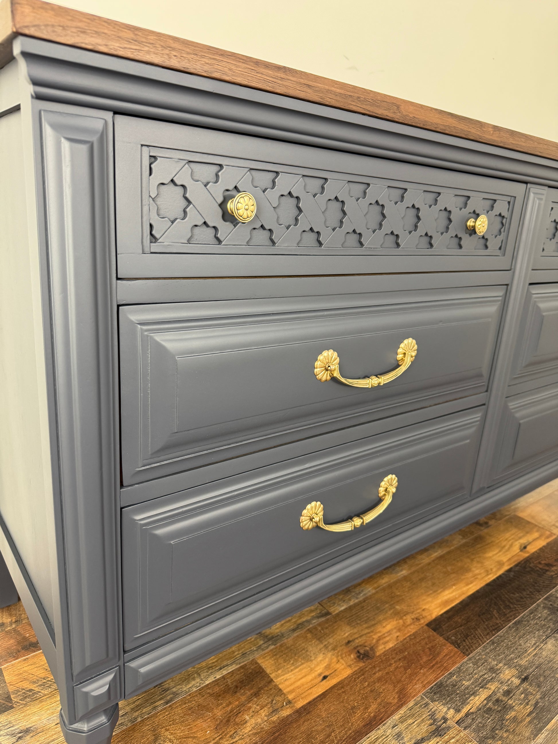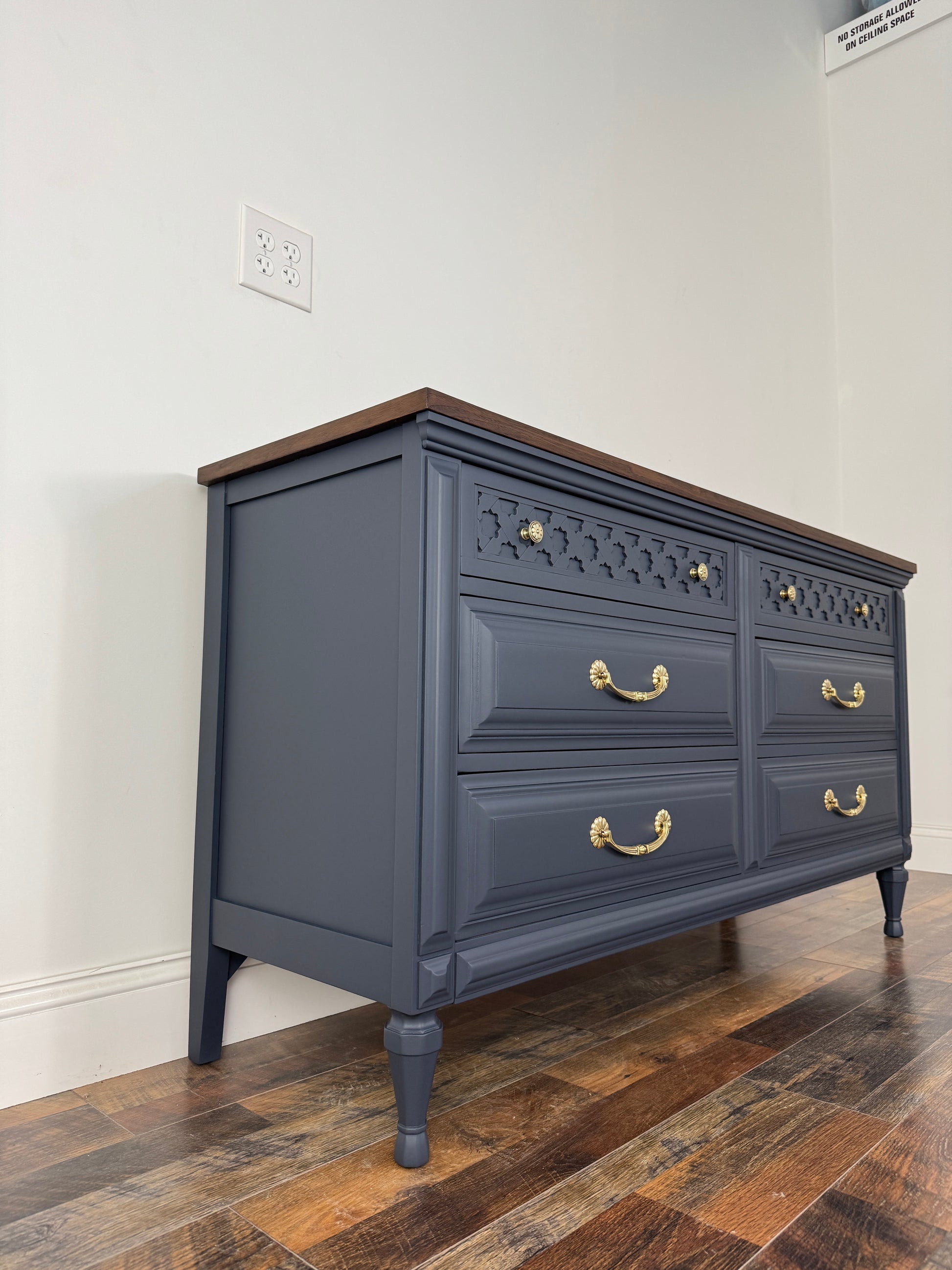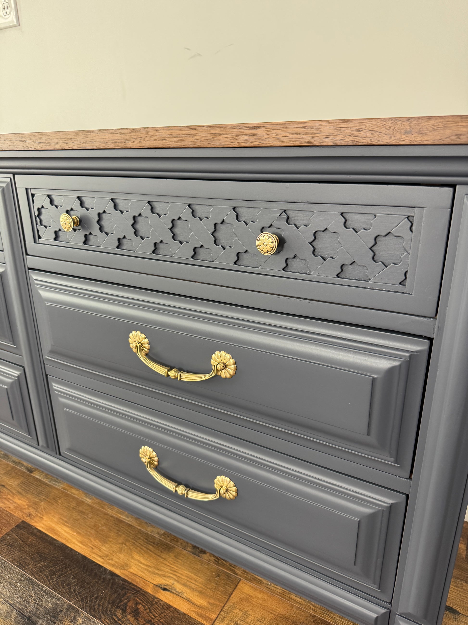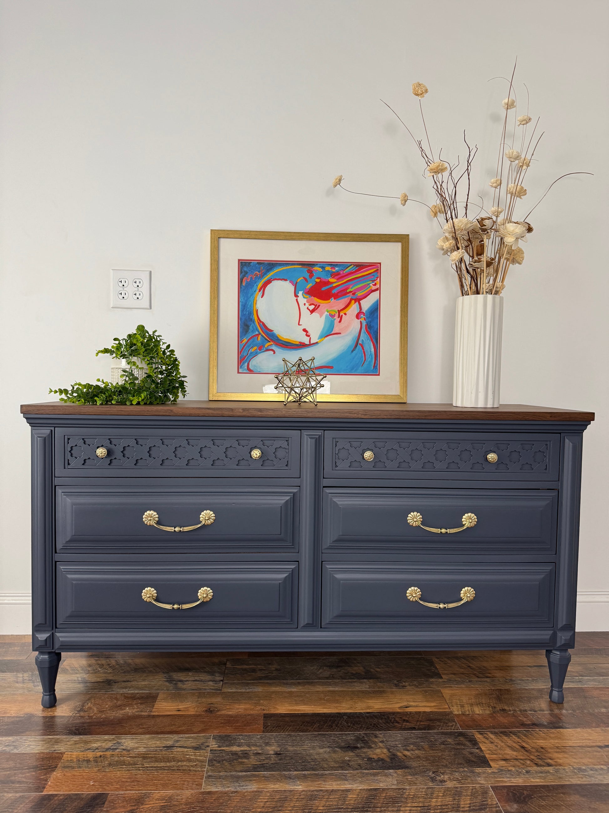 Beautiful dresser in sophisticated navy blue finish with natural walnut top. This striking piece features intricate geometric star lattice overlay design on the top drawers and original brass hardware throughout.
